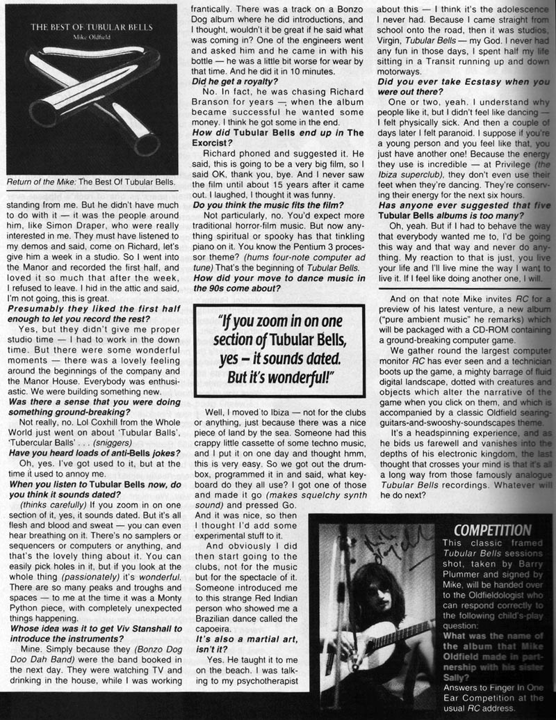And on that note Mike invites RC for a preview of his latest venture, a new album (“pure ambient music” he remarks) which will be packaged with a CD-ROM containing a ground-breaking computer game.